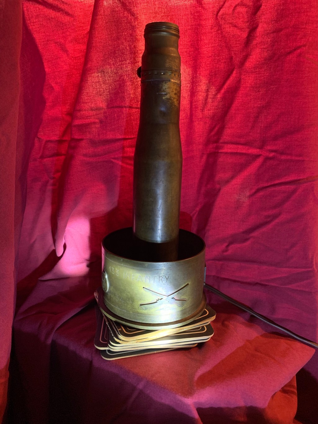 World War I Trench Art lamp made from an artillery shell honoring the 133rd Infantry Regiment 34th Infantry Division. The base of this lamp is a 105 mm shell. These shells were commonly used by M101A1 howitzer artillery pieces in World War II. They saw action in both Europe and the Pacific. Another brass shell makes up the lamp body. Engraving on the lamp base reads as follows: