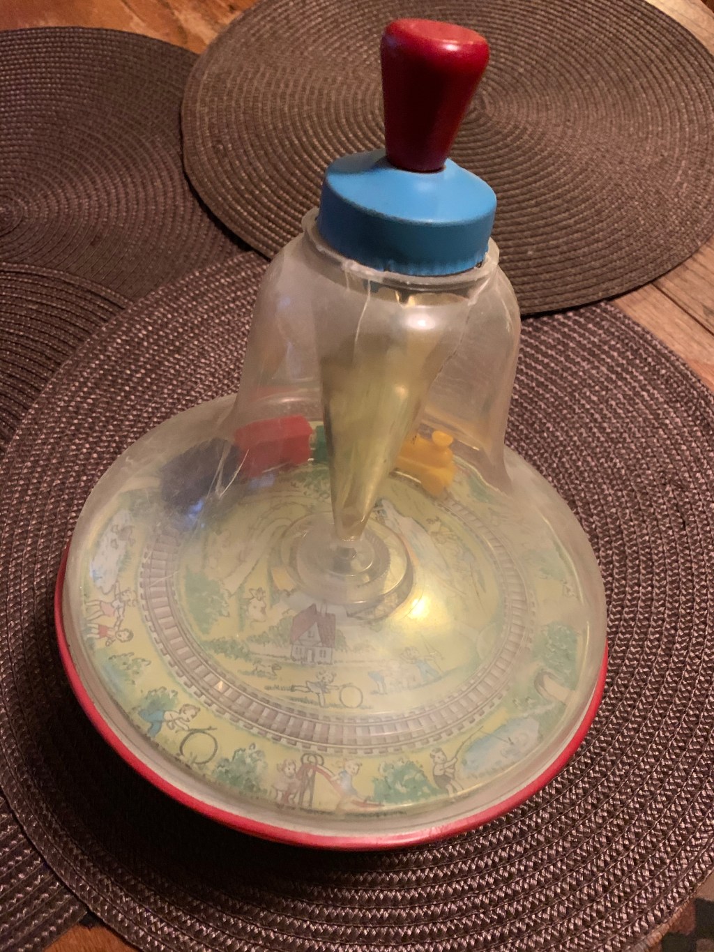 Vintage plastic top spinner with a suction cup at the bottom. Toy train on the inside. Probably made in the 1950s. As always would love to hear from anyone that knows more.